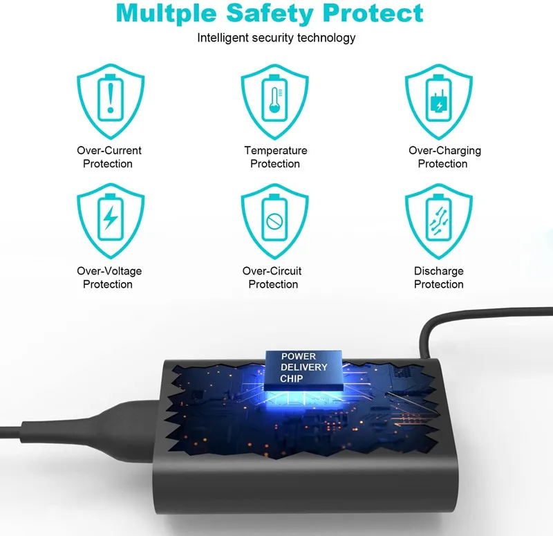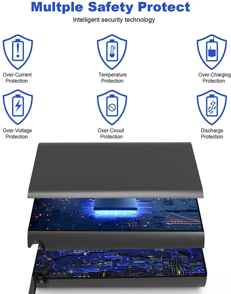 Built-in IC chip provides overcharge protection system, short circuit, overload protection, over-heat protection.
