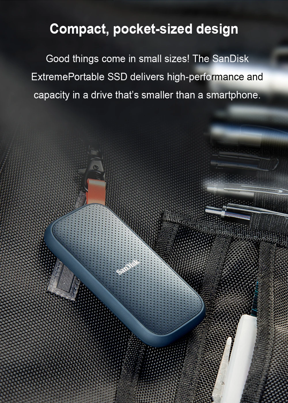 Solid state performance 1TB-2TB with up to 800MB/s read speeds in a portable drive. (Based on internal testing; performance may be lower depending on host device, interface, usage conditions and other factors. 1MB=1,000,000 bytes.)